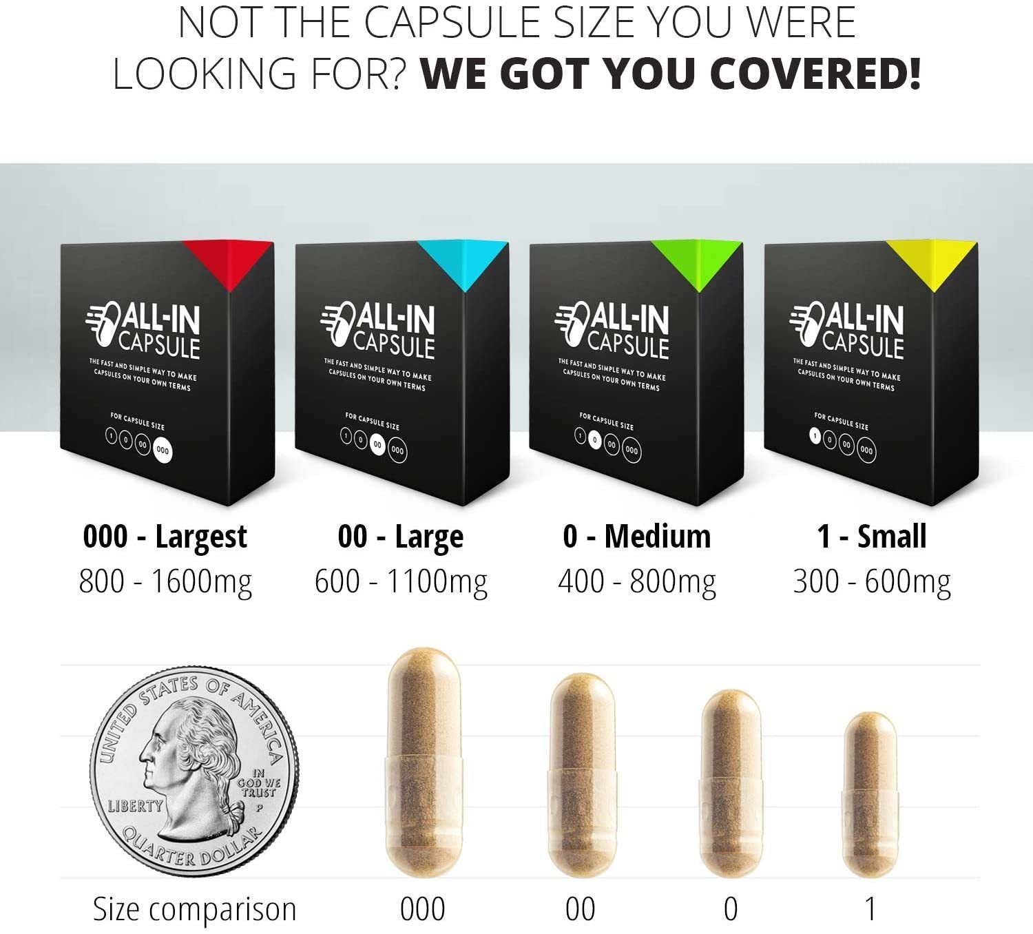 Most customers start with the size 00 (blue) ALL-IN Capsule machine, with the size 0 (green) being the second most popular option. We recommend using the size chart in the picture above to make the best decision for your needs.